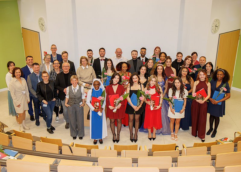 Insgesamt 29 Schülerinnen und Schüler haben ihre generalistische Pflegeausbildung am PflegeCampus Regensburg erfolgreich abgeschlossen. Der Jahrgang startete 2023 zu etwa gleichen Teilen mit Auszubildenden aus dem Caritas-Krankenhaus St. Josef Regensburg und dem Universitätsklinikum Regensburg, den beiden Trägerkrankenhäusern der Berufsfachschule. Die Abschlussklassen serenità und amorconcor zeichneten sich dabei besonders durch ihre kulturelle Vielfalt und ihre heterogenen biografischen Hintergründe – zum Teil bereits mit absolviertem Studienabschluss, zum Teil direkt von der Regelschule – aus.